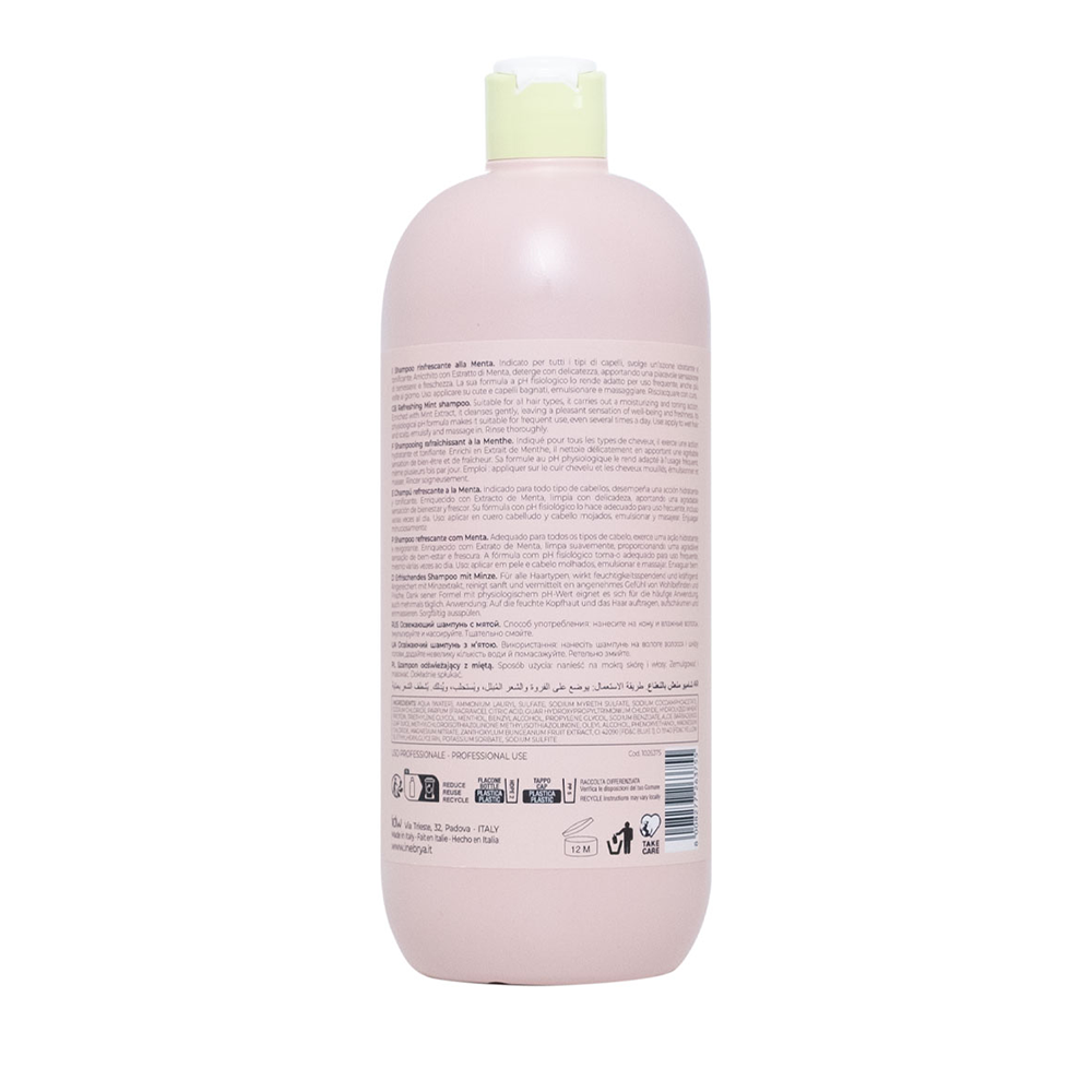 Deze verfrissende shampoo is geschikt voor alle haartypes. Het heeft een hydraterende en tonifiërende werking. Verrijkt met muntextract, reinigt het mild en geeft een aangenaam gevoel van welzijn en frisheid. Door de fysiologische pH-formule is het product geschikt voor frequent gebruik, zelfs meerdere malen per dag.