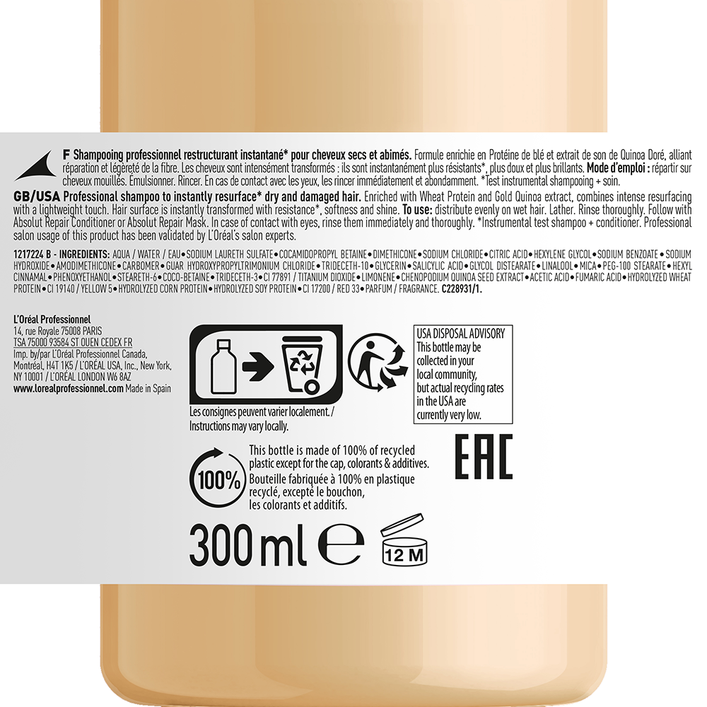 La formule professionnelle du shampooing resurfaçant instantané nettoie et restructure immédiatement les cheveux abîmés tout en les laissant légers au toucher.