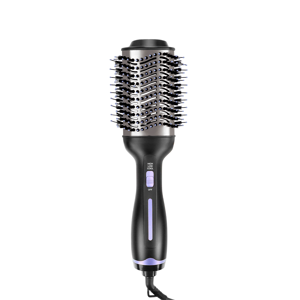 Cet appareil est à la fois un sèche-cheveux, un lisseur et une brosse. Il dispose de 3 niveaux de chaleur (faible, moyen et élevé) et son flux d’air de 360 °, garantit une meilleure couverture et répartition de la chaleur, et un séchage plus rapide. Avec sa plaque en tourmaline, rendez vos cheveux plus doux et plus brillants. Cet appareil est conçu avec des poils en nylon mélangés en 2 longueurs pour faciliter le démêlage et pour avoir une meilleure prise en main de vos cheveux.