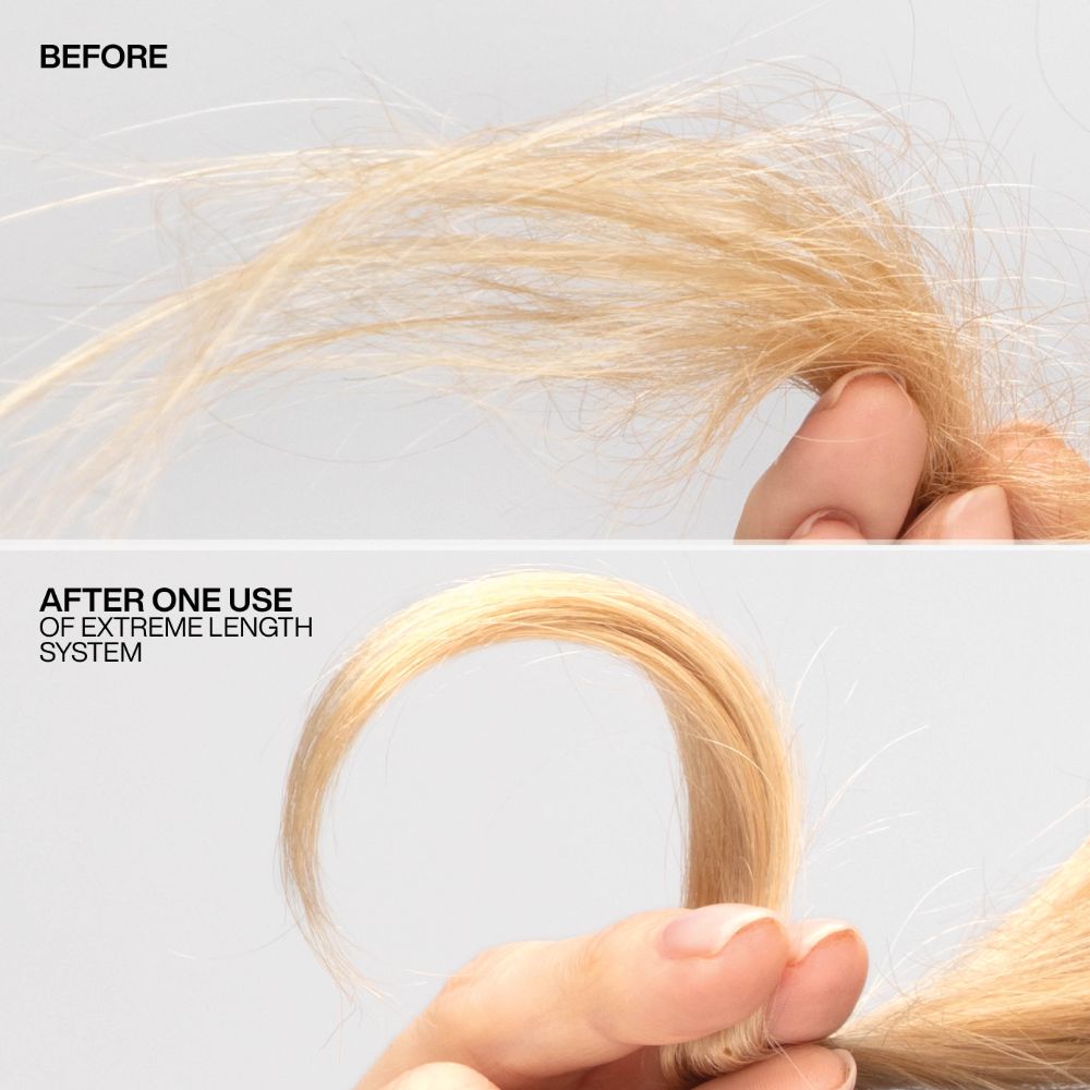Découvrez toute l’efficacité de Redken ! Grâce à une approche unique basée sur la science, nos produits sont élaborés pour apporter hydratation et protéines en respectant le pH du cheveu. Testés dermatologiquement et recommandés par les professionnels de la coiffure. Le soin sans rinçage Exteme Length de Redken fortifie les cheveux longs ou à la recherche de longueurs, y compris des cheveux colorés et décolorés. Il prévient efficacement les fourches et réduit la casse. Sachant que des cheveux sains peuvent pousser de 6 à 15 cm en un an, Extreme Length les aide à atteindre leur longueur maximale: jusqu’à 15 cm de croissance en un an. L’association du shampooing, après shampooing et soin sans rinçage Extreme Length réduit de 81% la casse des cheveux et aide à réduire l’apparence des pointes fourchues de 78%. Technologie/ingrédients clés : Biotine : Favorise l’activité cellulaire et la croissance des cheveux pour des longueurs et pointes plus saines. Huiles de Ricin. Formule Vegan.