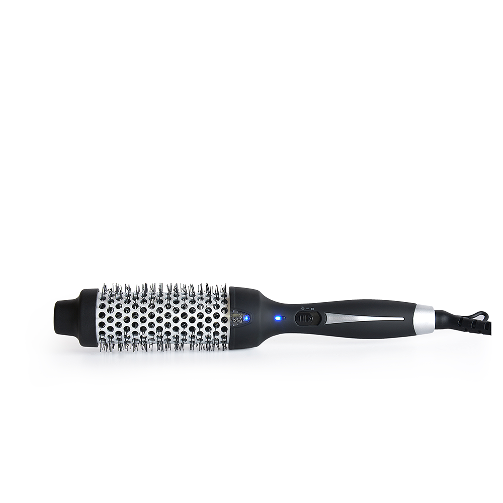 Brosse ronde révolutionnaire avec technologie ionique. Elle libère une grande quantité d’ions qui contrôlent l’humidité des cheveux tout en évitant les frisottis, offrant ainsi un fini doux et lumineux. Sa forme ronde permet de lisser et de faire des vagues professionnelles facilement. Pratique et confortable, avec une extrémité froide pour une manipulation sûre.
